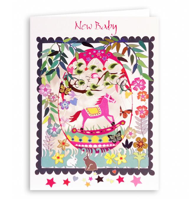 Forever Cards Laser-Cut Wenskaart - Pink Rocking Horse In An Egg (New Baby)